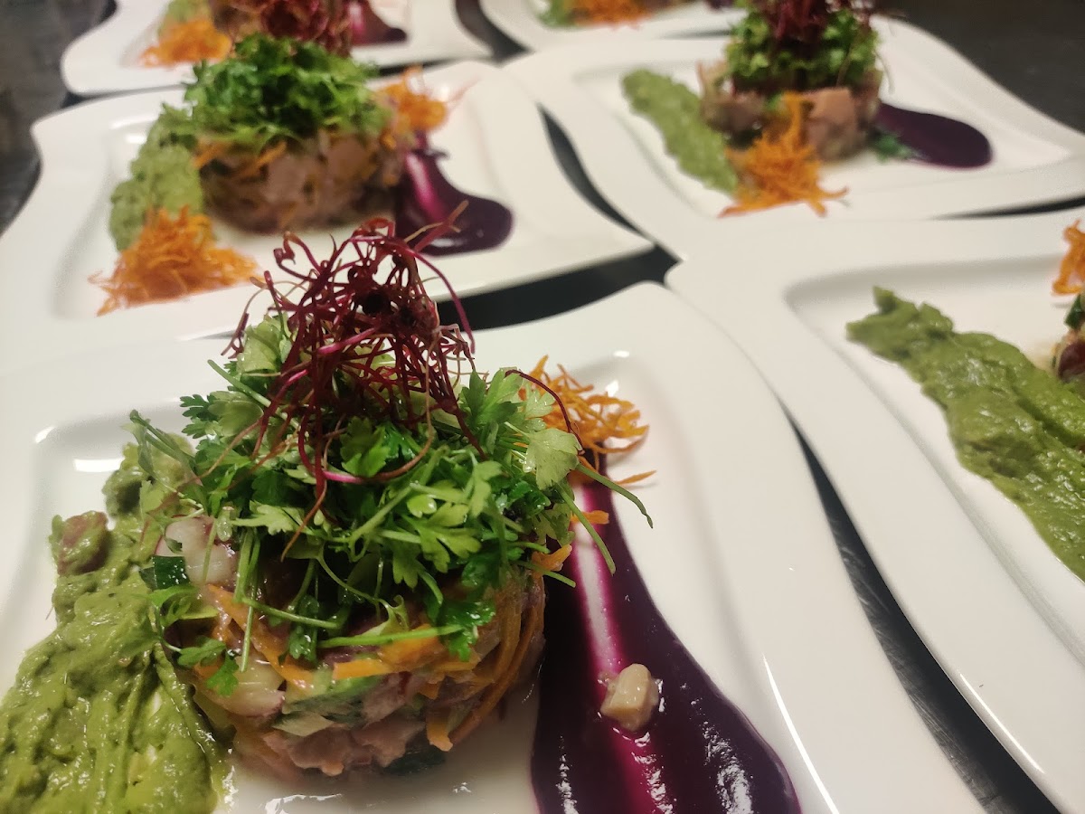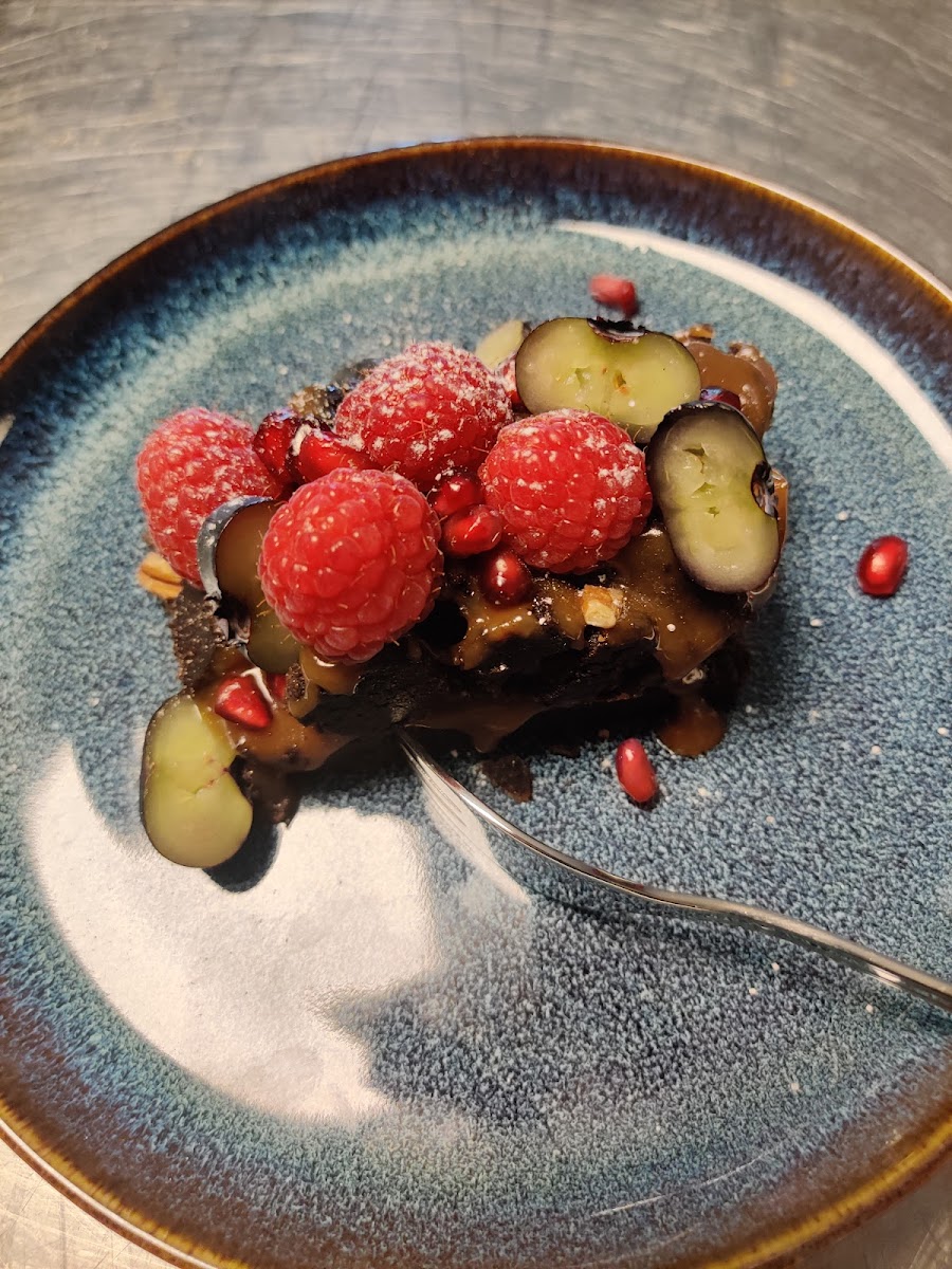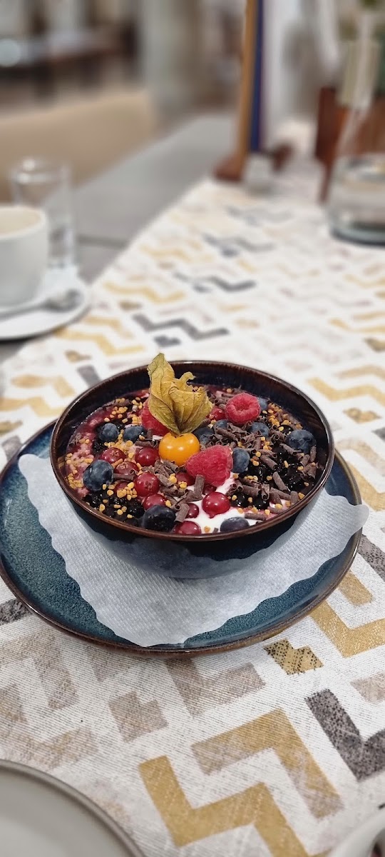As you step inside, you are instantly enveloped by a cozy atmosphere, accentuated by the café's elegant decor and meticulous attention to detail. The unique vaulted ceiling offers an air of sophistication, while the carefully curated furnishings ensure comfort and warmth. Whether you choose to sit indoors or dine al fresco in the enchanting guest garden — which boasts a Mediterranean flair and soothing background music — Café PurPur invites you to linger, sip, and savor.
