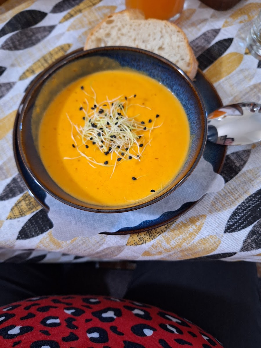 Ich war heute zum Frühstück/Brunch im PurPur, zunächst einmal war der Empfang von dem Herren (ich denke der Besitzer) sehr angenehm und höflich. Das Ambiente ist schlicht aber sehr schön eingerichtet, man kann draußen sitzen, sowie drinnen (mehrere Sitzmöglichkeiten). Draußen ist es herrlich bei Sonnenschein! Es war super sauber und ordentlich, auch die Toiletten. Die Preise sind salzburgerisch aber der Umfang des Essens ist wirklich ausreichend. Die Teller sind liebevoll angerichtet, das Essen gut. Lediglich frischeres Brot wäre als kleiner Kritikpunkt anzubringen, es war warm und aufgebacken, jedoch hatte ich das Gefühl es käme aus dem Sackerl. Ich finde es gut, dass auch vegane Kost angeboten wird. Ich bin Vegetarierin und für mich wurde das Frühstück aufmerksam abgeändert. Sehr lieb! Ich komme gerne wieder